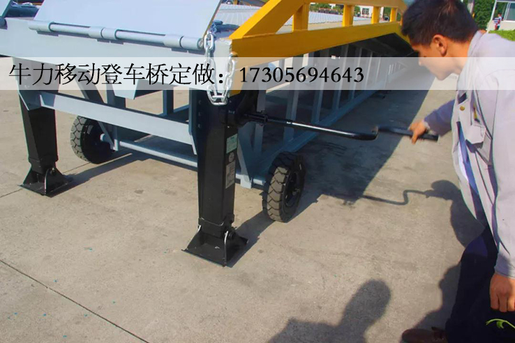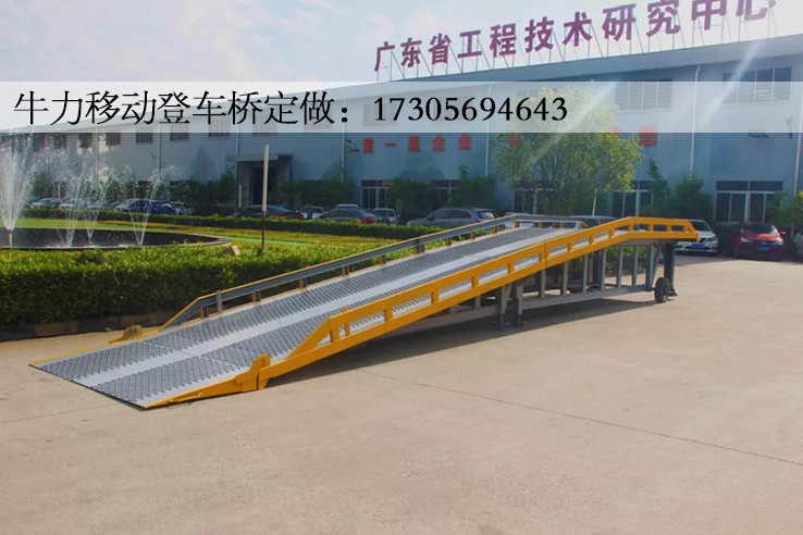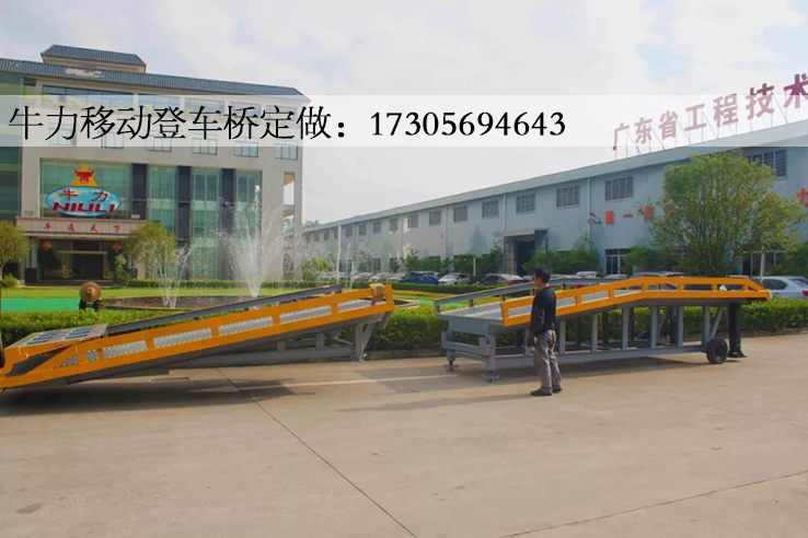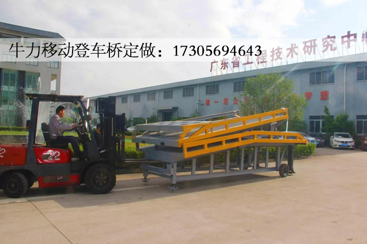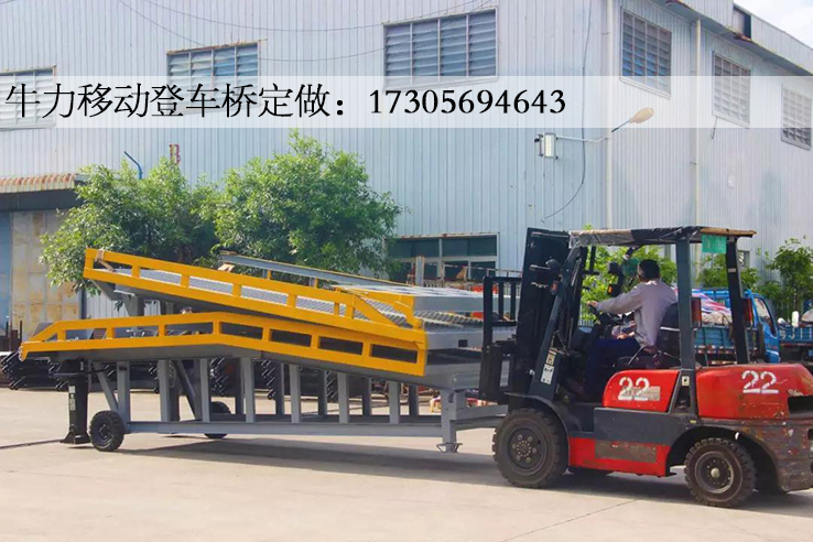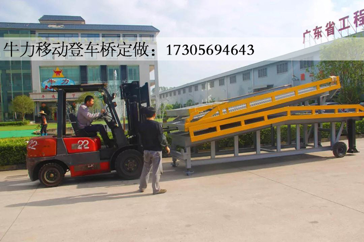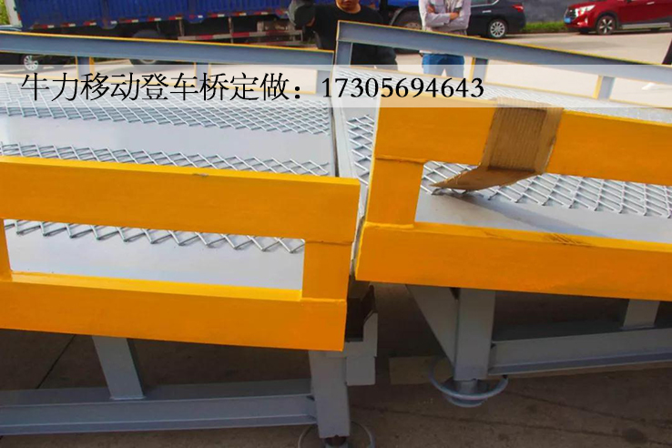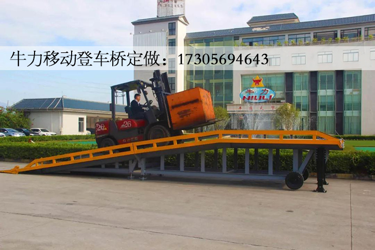 折叠式登车桥是与叉车配合使用的货物装卸辅助设备,在地面和车辆之间搭起桥梁,可根据汽车车厢的高低调节高度,叉车可以直接通过它驶入车厢内进行货物的装卸作业。